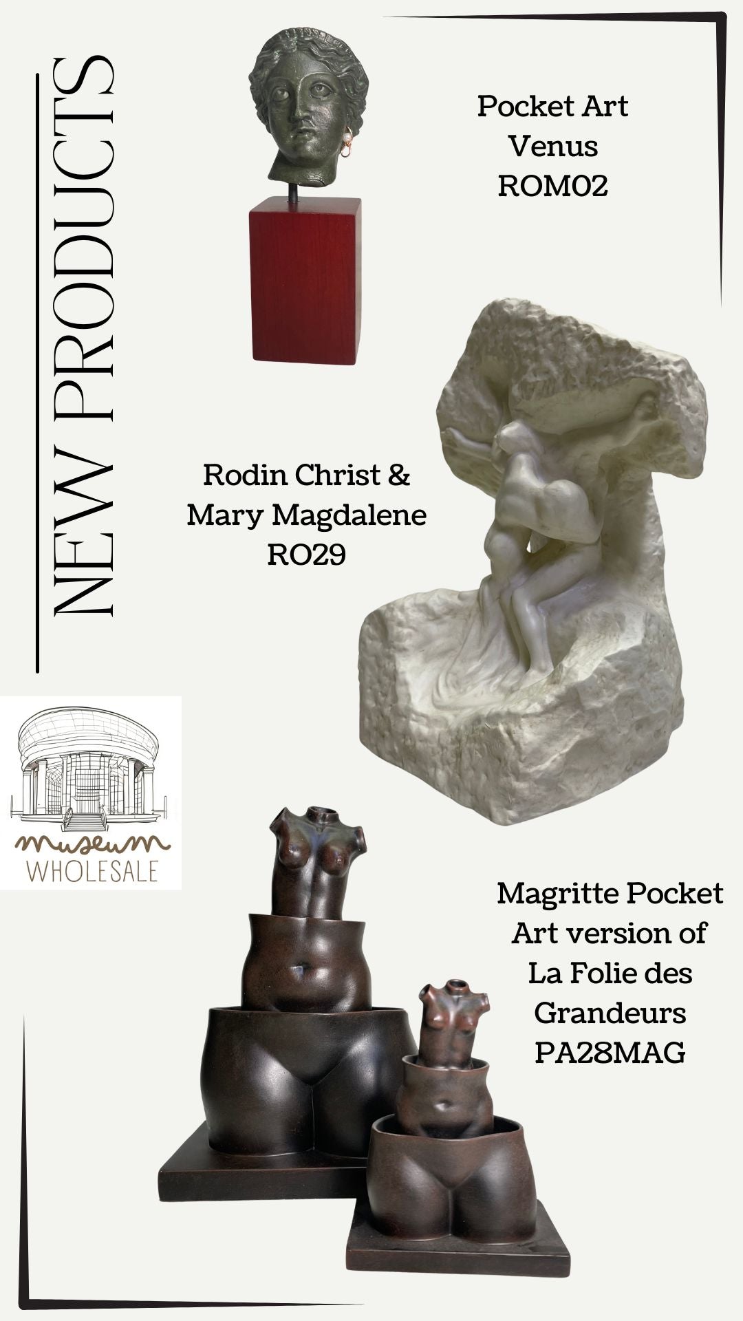 The Parastone Collection is growing again. We have three new pieces which will amaze your customers when they see them first hand. There is a small scale Roman Venus Head on Base, Rodin's Christ and Mary Magdalene Statue, and a Pocket Art version of Magritte's La Folie des Grandeurs.