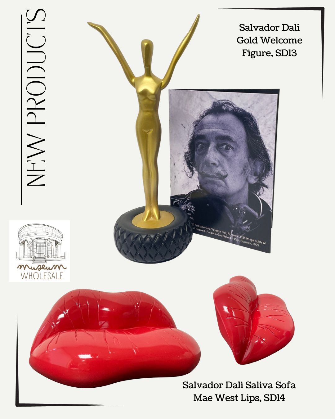 Introducing two new licensed reproductions from the Parastone Museum Collection: SD13, Welcome Statue – Gold Figurine on Tire and SD14, Saliva-Sofa – Red Lips Figurine. Each piece captures Dalí’s surreal imagination in three-dimensional form, faithfully produced with permission from the Gala–Salvador Dalí Foundation.