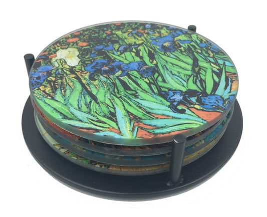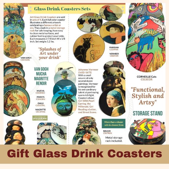 Decorate your coffee table with glass drink coasters by your favorite masterpiece artist. Each set includes 4 glass coasters (3 7/8 inches diameter x 1/8 inch thick) and a metal storage rack. Set includes one each of four different masterpiece paintings.