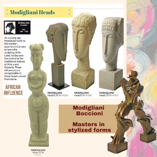 We have included a very famous Boccioni statue, Futuristic Man, in this category because this artist too had an abstract, stylized approach and worked during the same era. In contrast to Modigliani, however, Boccioni was sculpting movement. The Futuristic Man is about a dynamic stride instead of a conscious adoption of a primitive form.