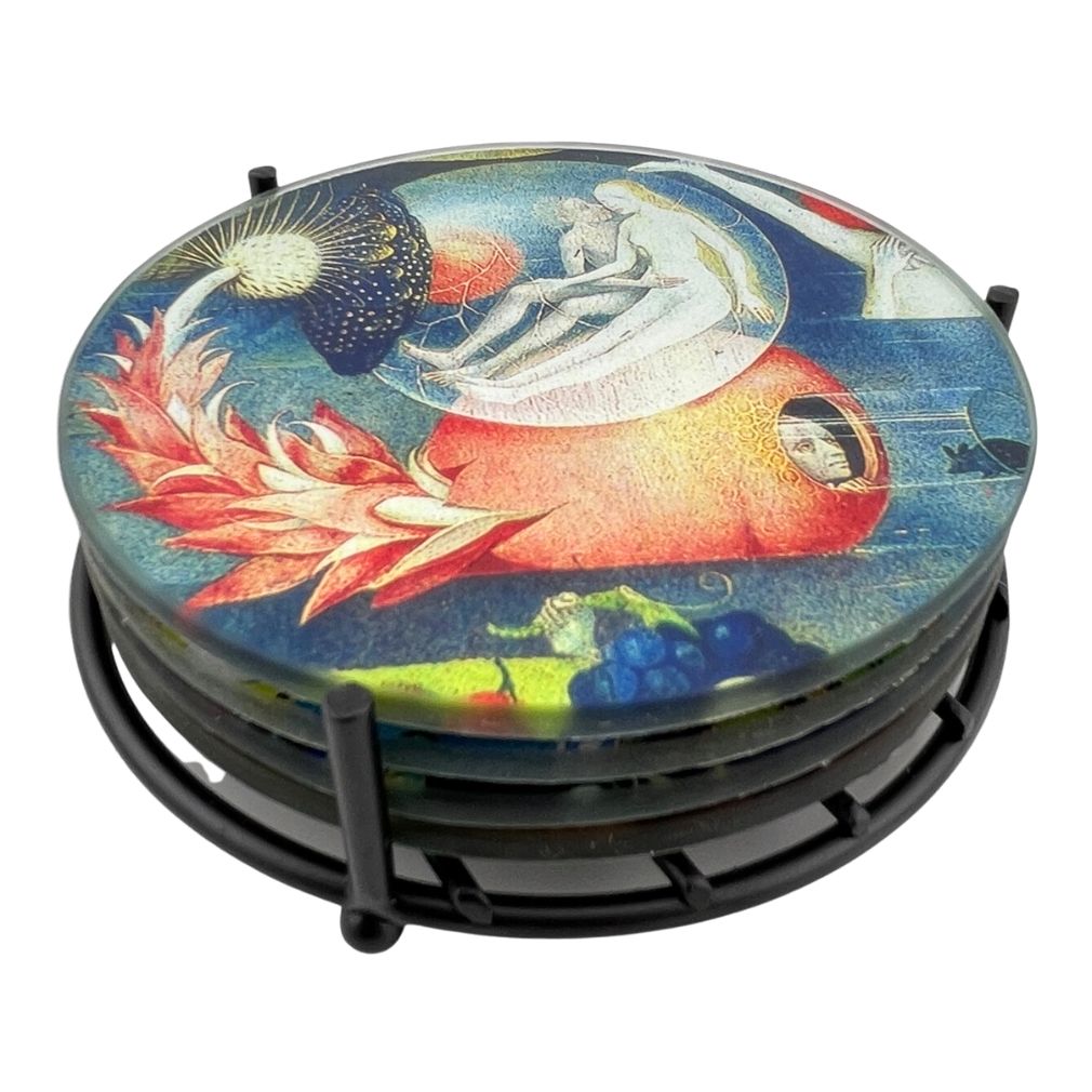 Decorate your coffee table with glass drink bar coasters of Hieronymus Bosch's Heaven and Hell Fantasy Paintings. Each drink coaster shows a different painting from Bosch's oeuvre including Bird with Letter, Treeman, Fountain from Garden of Earthly Delights and Bubble Couple.