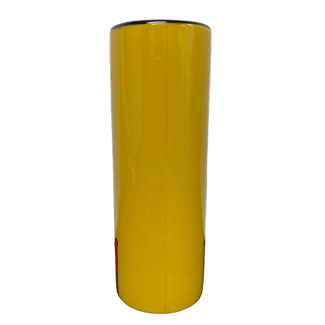 Ceramic vase with Steinlen's painting of Le Chat Noir (Black Cat). The front side shows the cat and the original text from Steinlen's illustration. The back is solid yellow. Part of the Parastone Museum Collection. Measures: 7 in H x 2.5 in W x 2.5 in D. Weighs 14 oz. PN VAS10ST